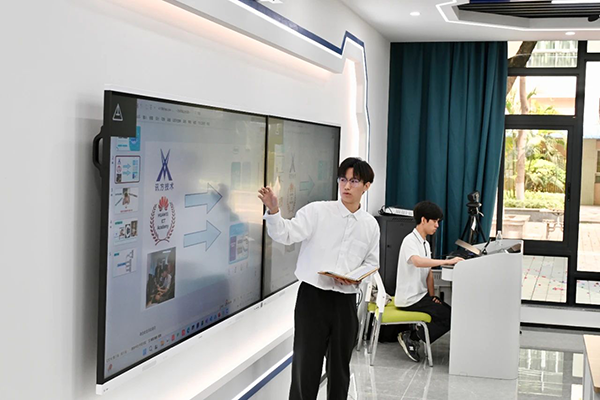 在鲲鹏云服务实验室,吴俊烽同学展示了他所带领的学生团队与华为ICT学院、金数据技术联合打造的“DeepSeek-Study智学领航”AI电子教材。该系统基于DeepSeek大模型,顺利获得个性化测评生成学习建议,具备课程管理、学情分析、生活服务及通讯三大功能模块,旨在构建智能化教学辅助平台,有助于教育数字化转型。