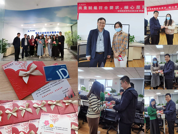 在金数据华为云事业部东莞区域,公司的“男神”主管们为各位女神们亲手奉上了专属礼物以及精美的节日贺卡,感谢她们的辛勤工作和付出。大家手拿着这份精心准备的礼物,脸上洋溢着灿烂笑容,纷纷合影留念。